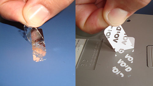 Recomendado para LACRES pois evidencia a tentativa de remoção, muito utilizado na indústria de informática para dar segurança aos componentes e acessórios dos mesmos.